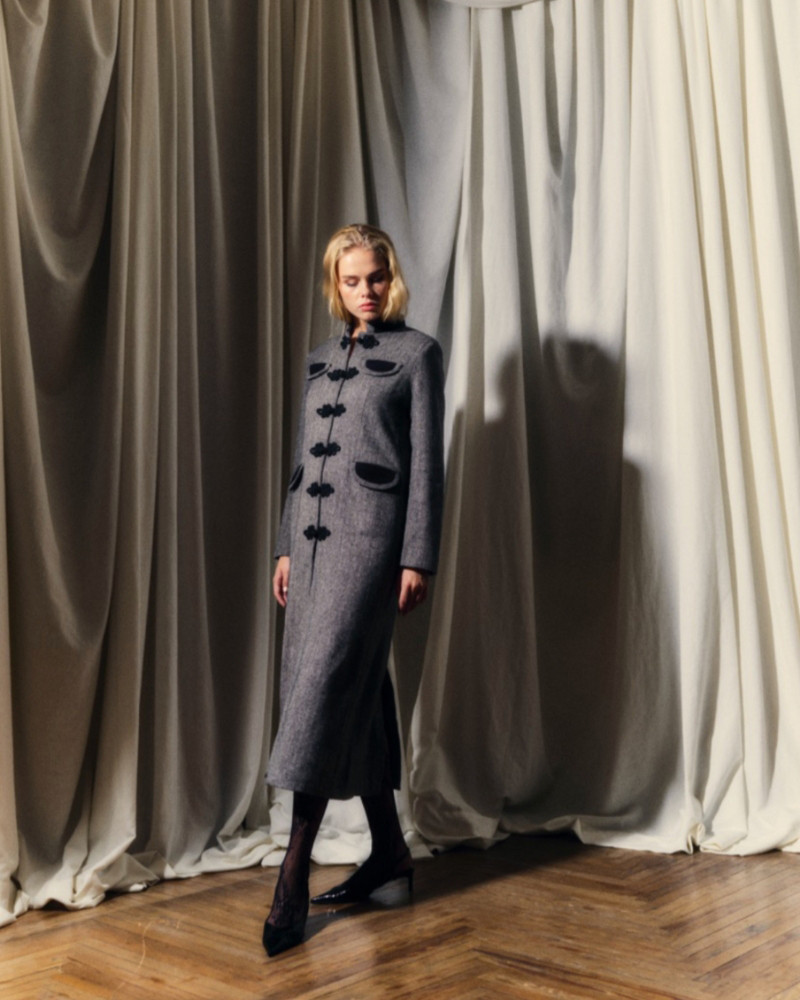 Abrigo gris con hombreras que aportan estructura, alamares importados de la India, cuello mandarín y discretos bolsillos redondeados.