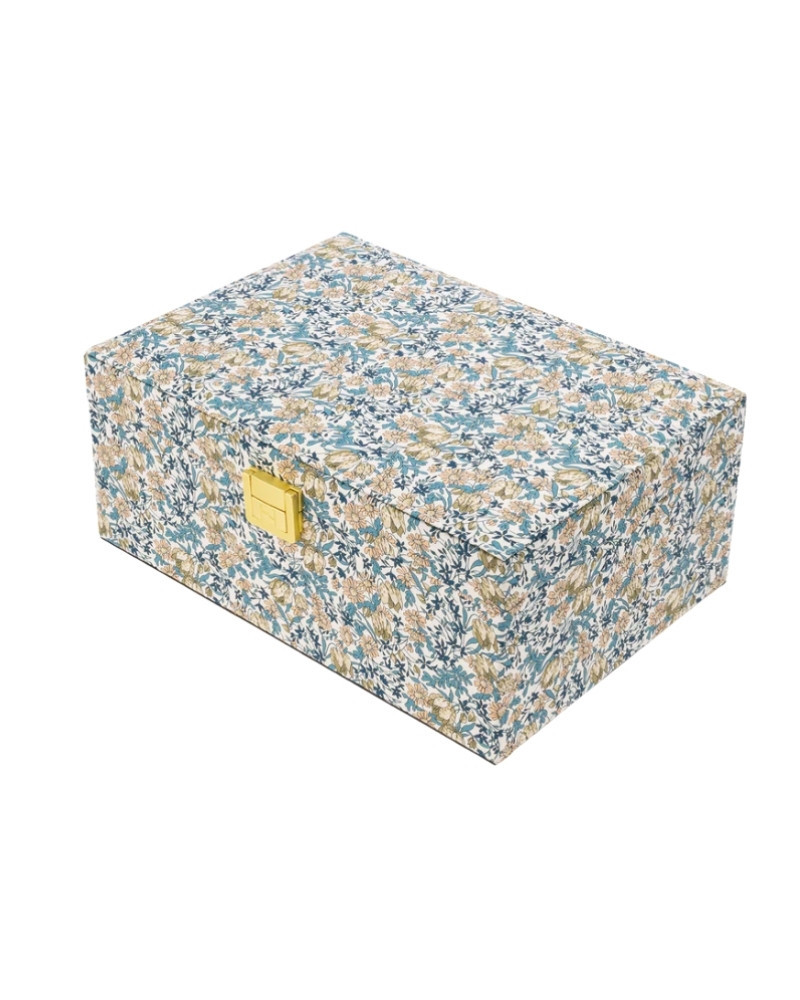 Joyero fabricado en tela liberty que presenta una intrincada sinfonía de flores silvestres, incluyendo margaritas y tulipanes Fritillaria estampados.