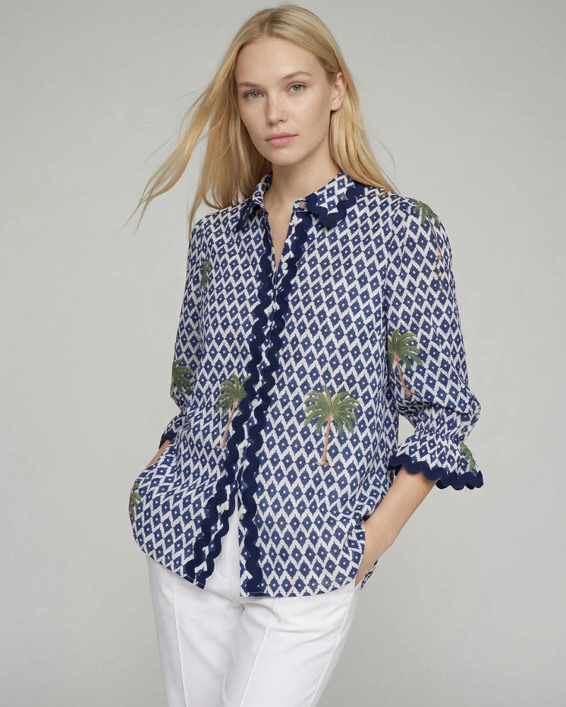 Camisa estampado ikat en tonos azul y blanco, con ilustraciones de palmeras. Presenta cuello camisero y cierre frontal con tapeta decorada con ondulina en contraste.