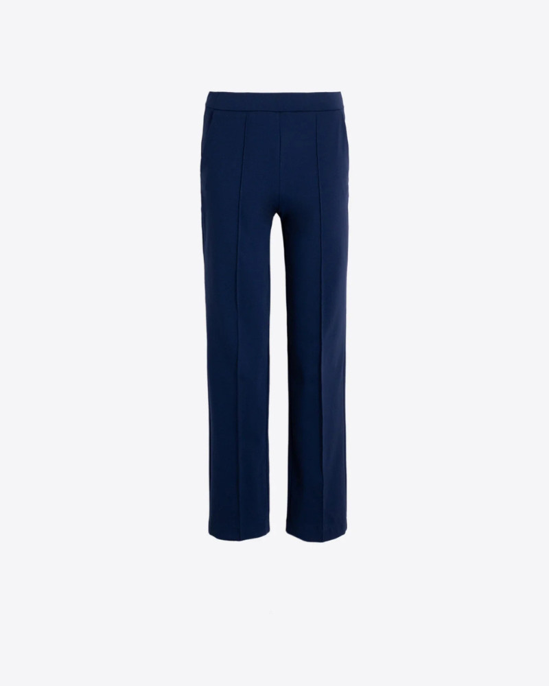 Pantalón marino de corte recto con cintura lisa y líneas verticales marcadas en delantero.
