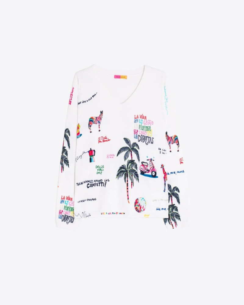 Jersey blanco con cuello pico y estampados quirky multicolor. Manga larga y tejido de punto ligero. Corte recto.