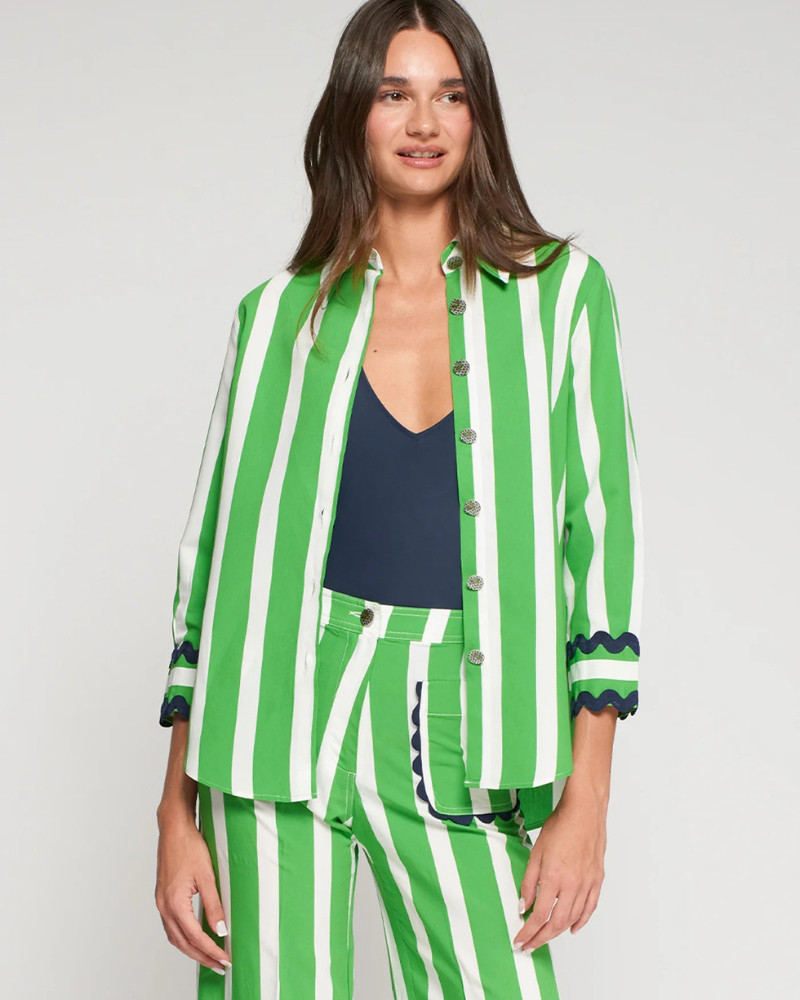 Camisa de rayas verticales en verde y blanco. Cuello camisero, cierre frontal con botones y manga 3/4 con puños con ondulina en contraste en azul marino y bajo redondeado.