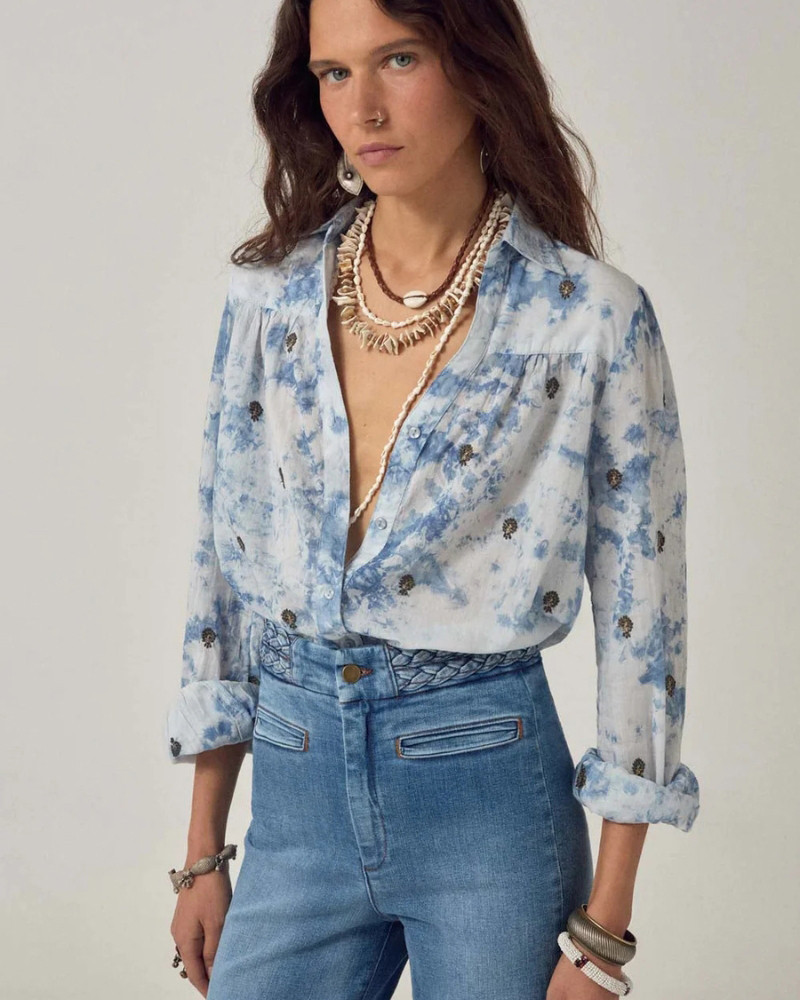 Blusa de manga larga con cuello en algodón teñido anudado con pequeños motivos integrales. Cierre frontal abotonado y cuello clásico. La base del teñido anudado se mueve entre tonos azules zafiro, alternando entre intensidad y transparencia. Pequeños motivos marcan la superficie, aportando estructura y ritmo. Azul zafiro intenso con pigmento en capas, fresco y vibrante. La técnica de teñido anudado artesanal hace que cada pieza sea única y presenta ligeras variaciones de color. Algodón suave y transpirable.