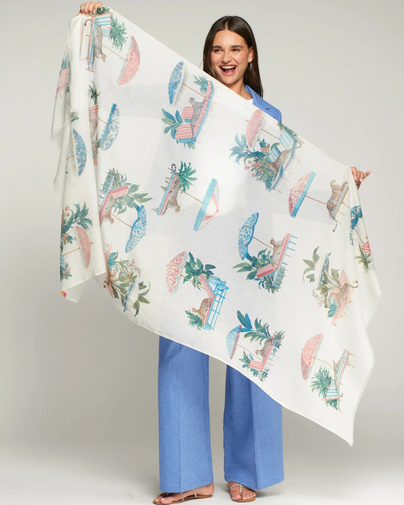 Pañuelo rectangular estampado de leopardos y sombrillas.