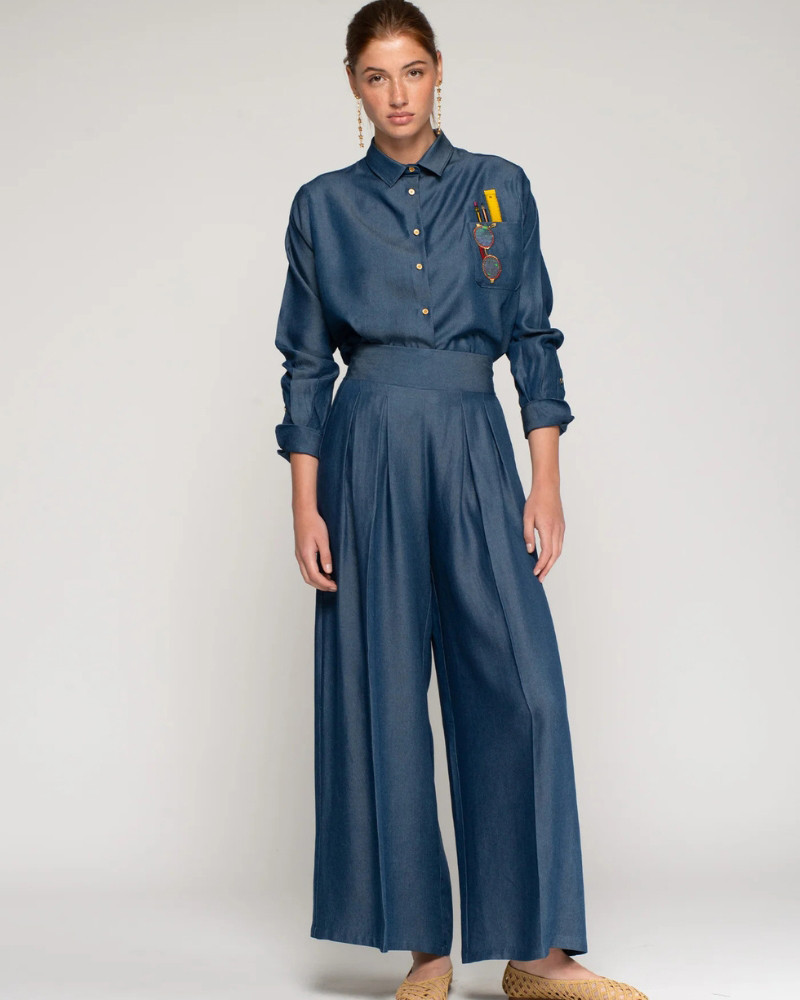 Pantalón de corte ancho en tejido denim ligero. Cinturilla ancha y pinzas frontales. Bolsillos laterales