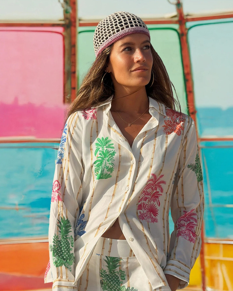Camisa de corte clásico con cuello camisero y cierre frontal de botones. El diseño combina un estampado vertical de varas de bambú con ilustraciones de motivos tropicales en colores vivos. Manga larga con puños abotonados y bajo recto.