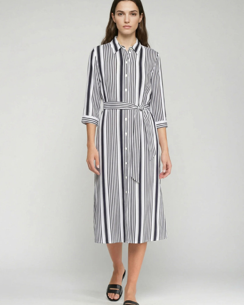 Vestido camisero de largo midi con estampado de rayas verticales en marino y blanco. Cuello clásico y cierre frontal con botones. Mangas tres cuartos. Incluye cinturón del mismo tejido