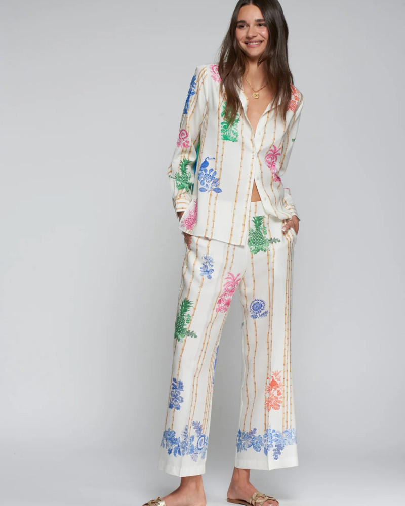 Pantalón de corte recto con estampado bambú sobre fondo crudo, combinado con motivos tropicales multicolor distribuidos en la prenda.
