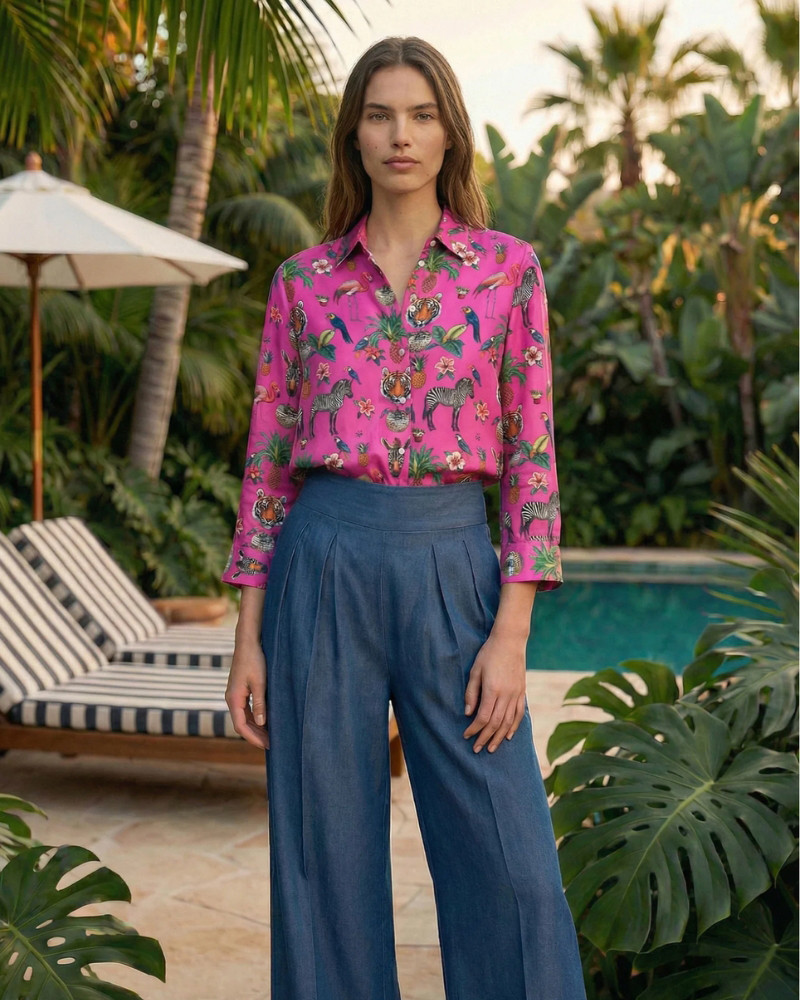 Camisa en color fucsia estampado Jungle Disco con motivos de animales exóticos, plantas tropicales y bolas de discoteca.