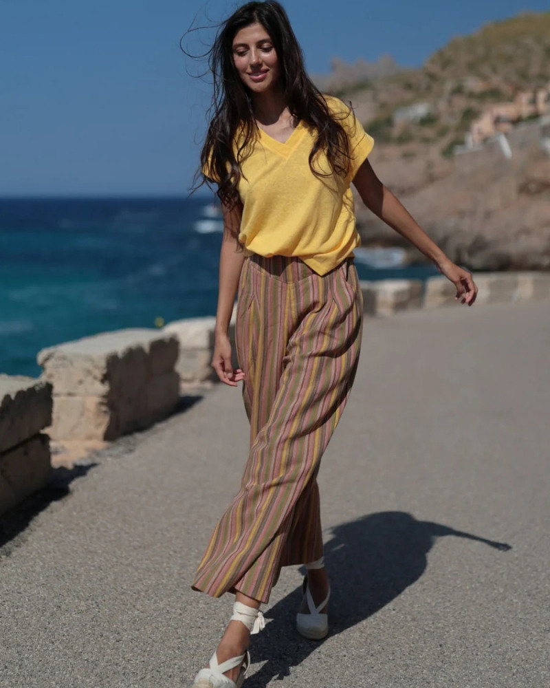 Confeccionado en un tejido ligero con textura natural, es la opción ideal para combinar con prendas de punto o lino y lograr un look equilibrado, sofisticado y lleno de luz.
