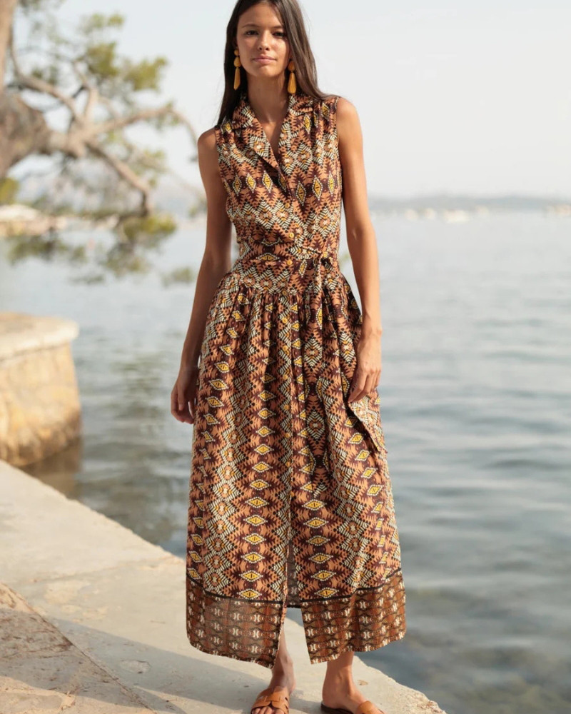 Confeccionado en un tejido ligero y fresco, presenta una paleta de tonos tierra, ocres y tostados que resaltan el bronceado y evocan atardeceres frente al mar.