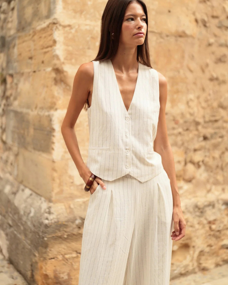 Chaleco sastre de lino con raya diplomática redefine la elegancia estival mediante una estética minimalista y depurada.