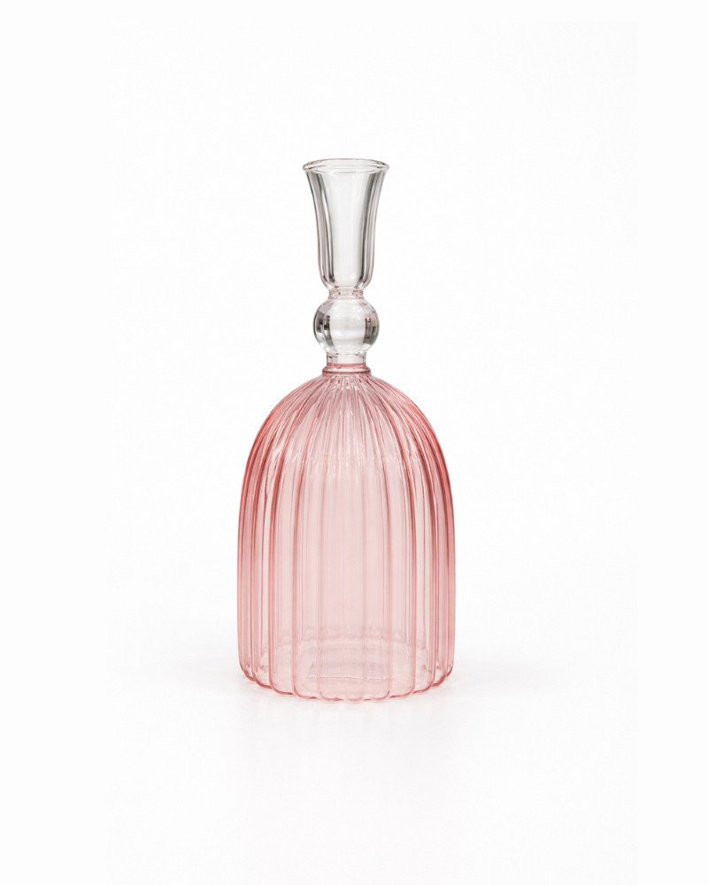 Portavelas de cristal con forma de botella estriada en color rosa, ideal para crear ambientes cálidos y acogedores. Su diseño se adapta a cualquier estilo decorativo, aportando un toque de sofisticación.