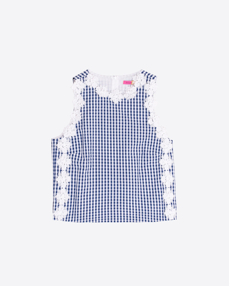 Top de cuadros azul marino con diseño recto y escote redondo. Los laterales y el contorno superior están decorados con aplicaciones de flores en relieve.