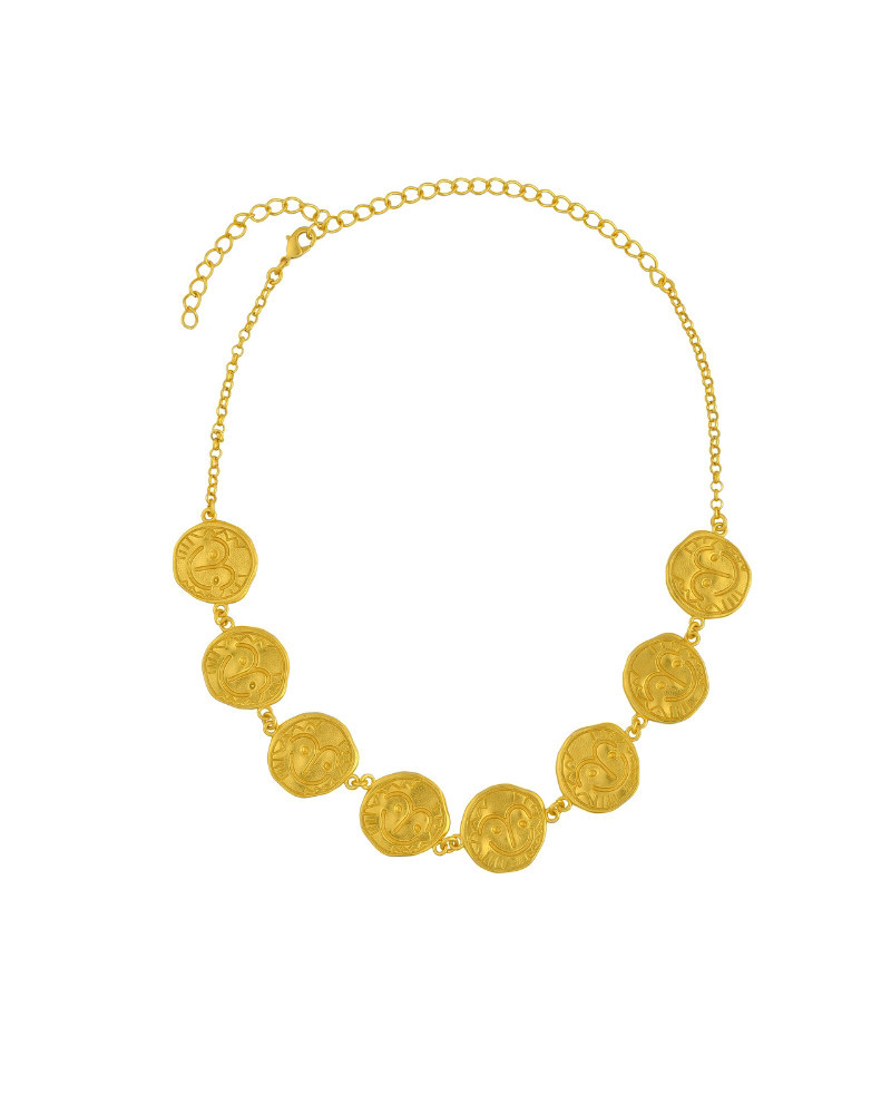 Gargantilla de latón con baño de oro. Presenta un motivo de un Duende Feliz, un amuleto destinado a traer luz y protección.